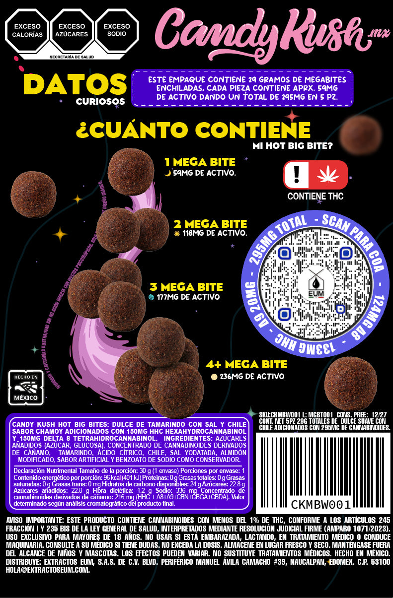 Contenido: 295mg de cannabinoides por bolsa (29g de BIG BITES enchiladas, 5PZ).